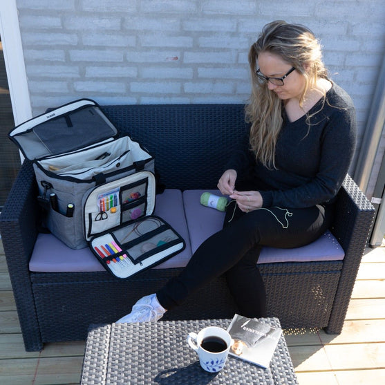 Skal du ud at rejse eller i sommerhus, og vil du gerne tage flere forskellige projekter med, så er vores ultimative garntaske din bedste ven. Den er nem at pakke i bilen og er perfekt til at have stående ved siden af din yndlings lænestol eller sofa.