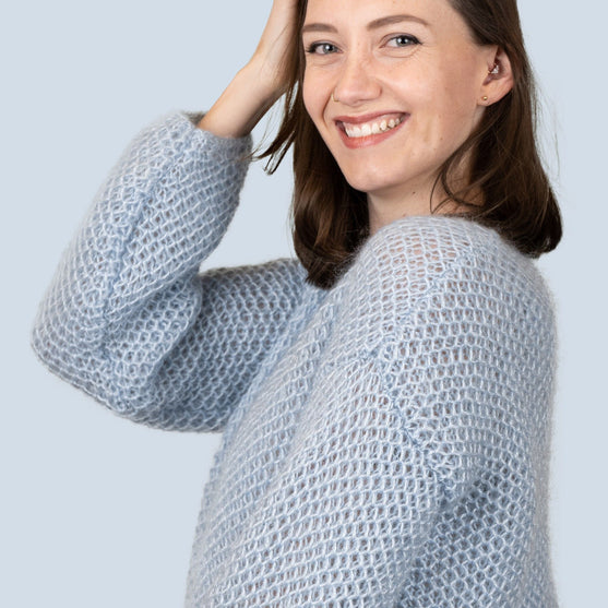 Blusen strikkes i netpatent, som er dét, der giver blusen det flotte og specielle mønster.