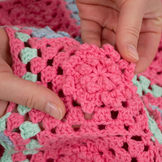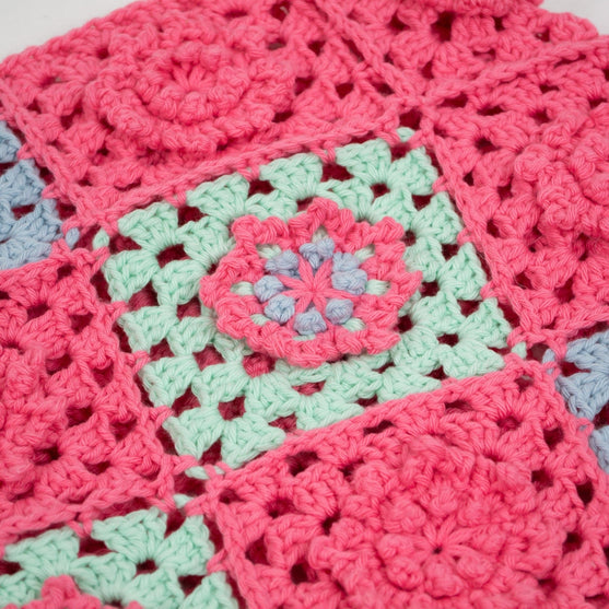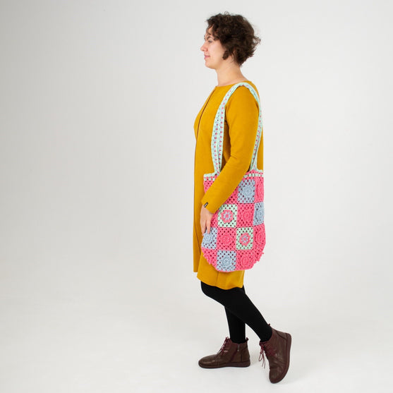 Denne taske består af 30 hæklede firkanter i forskellige farvekombinationer, der hækles sammen undervejs i arbejdet. Brug din fantasi og kombiner firkanterne på andre måder, så du skaber dit eget unikke hækleprojekt! Du skal bruge 6 nøgler, hvis du vil lave en helt ensfarvet taske.