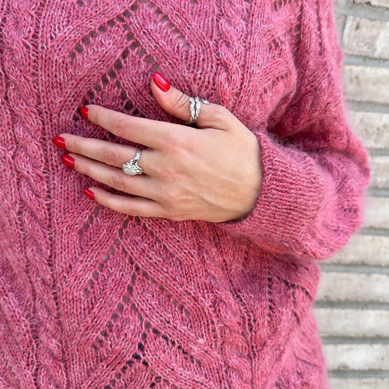 Sweateren afsluttes med 1x1 ribkanter ved den nederste kant og i halsen.