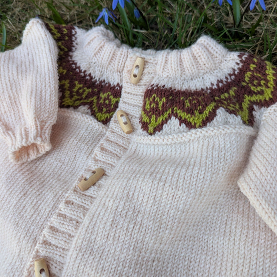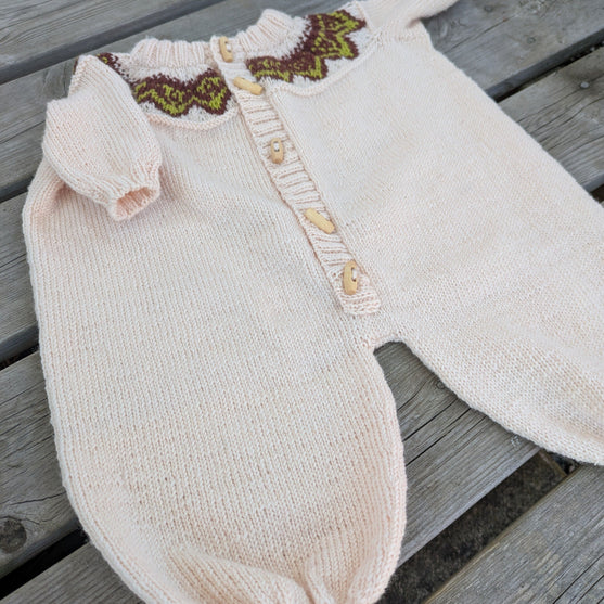 Petal er en rummelig babydragt, som strikkes oppefra og ned. Petal kan strikkes enten som en dragt med ben eller som en kørepose. Begge versioner er beskrevet i opskriften.